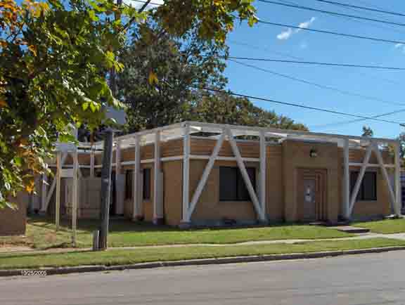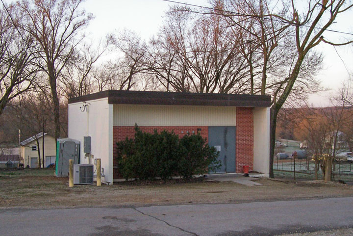 Houses a Nortel Remote Switch Concentrator hosted by the Sikeston DMS100. It was earthquake braced in the 1980s but it was such a substantial building that it only required a bit of diagonal steel reinforcement as seen on the front wall. |