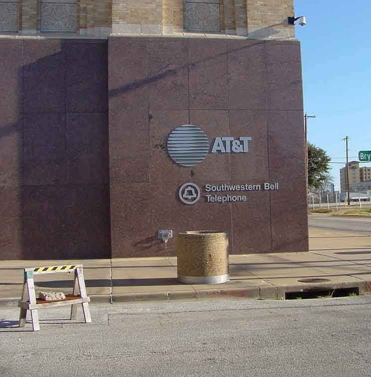 AT&T logo on marble facade and classic southwestern bell logo still present.
